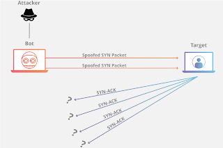 Serangan ini mengekploitasi TCP dengan cara mengirimkan paket SYN dengan spoof alamat IP dalam jumlah yang besar. Setiap koneksi yang masuk akan ditanggapi oleh server yang menunggu proses koneksi berjalan, namun tidak pernah terjadi. Hal ini akan mengakibatkan proses yang terus berjalan pada server yang dapat menyebabkan overload.